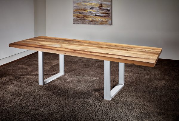 Sie suchen einen nachhaltigen Esstisch nach Maß? Hier sehen Sie unser Modell Möhnesee. Diese Kollektion steht für Esstische aus Altholz. Unsere Altholz-Tischplatten werden aus bis zu 200 Jahre alten Eichen-Bohlen gefertigt. Beim Abriss von Bauernhöfen, Stallungen und Gehöften in europäischen Bergregionen werden diese aus dem Fachwerk und den Dachstühlen geborgen. Über Jahrzehnte hat das Holz Sonne, Regen und Wind standgehalten. Dadurch haben die alten Holzbohlen ihre einzigartige Struktur erhalten. Kernrisse, Astlöcher, kleine Splintstreifen, teilweise auch Holznägel sowie eine lebhafte Maserung bestimmen die Optik unserer Altholz-Tischplatten. In der Abbildung zeigen wir eine 240 cm lange Altholzplatte, diese wird von 2 Edelstahl-Kufen getragen. Gern bieten wir Ihnen auch andere Maße und auch andere Gestelle bzw. Tischbeine an. Kleinere Altholzplatten mit einer Abmessung von 160 cm x 80 cm und auch Varianten von 320 cm x 100 cm sind lieferbar!
